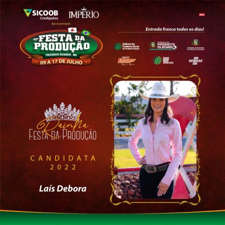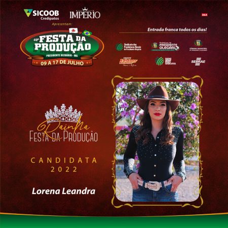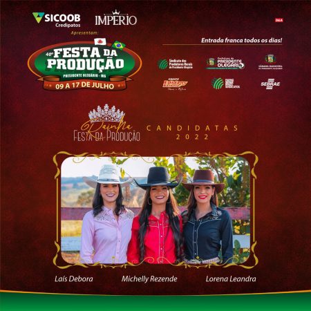 As três belas candidatas ao título de rainha da 40ª Festa da Produção são: Laís Débora Pereira, 23 anos, Lorena Leandra Batista, 23 anos e Michelly Rezende da Silva, 21 anos. As candidatas serão avaliadas por um grupo de jurados. A vencedora representará a beleza da mulher olegariense.