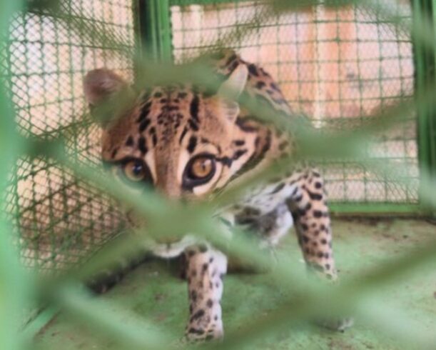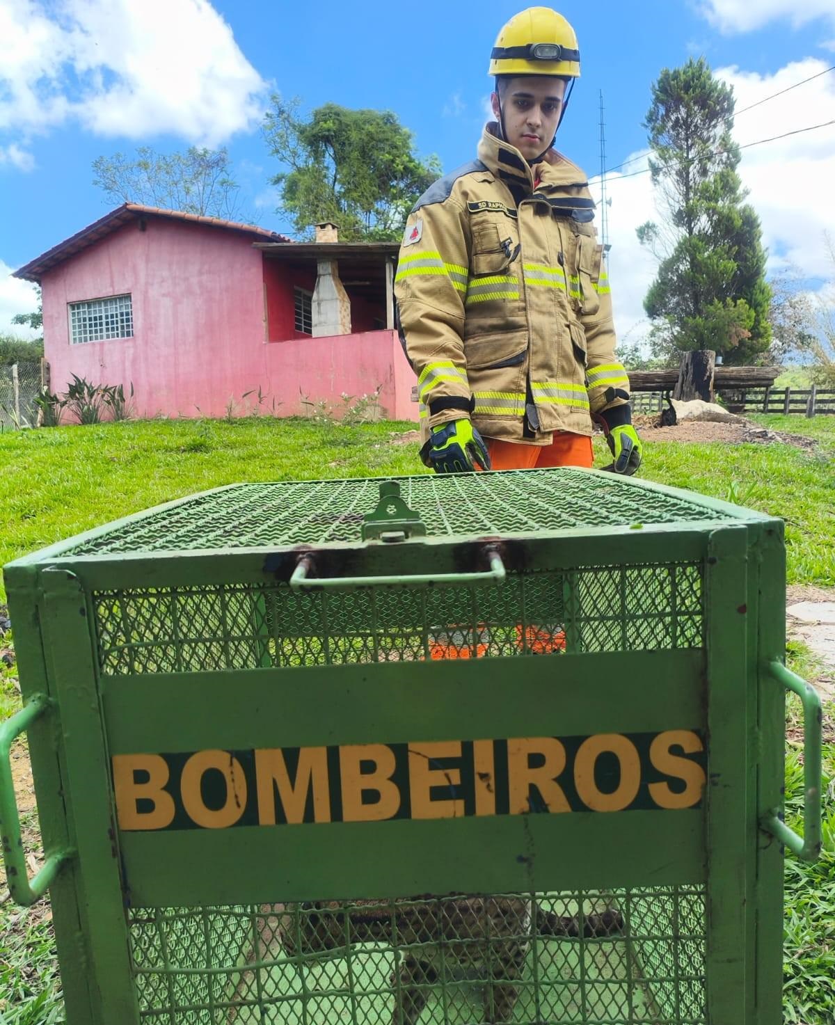 Jaguatirica foi contida em um cômodo da construção abandonada. Com a chegada da guarnição, equipada com roupa de proteção e cambão, ela foi contida e colocada em gaiola apropriado para o transporte.