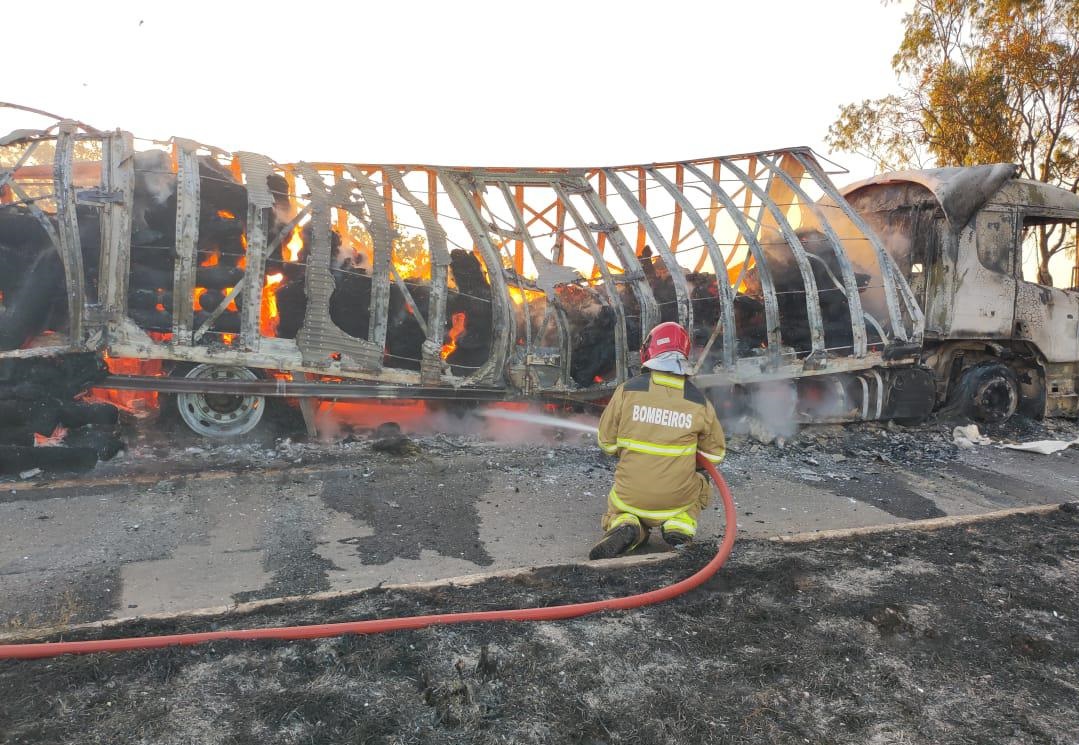 Um caminhão trucado que transportava tecido para a região Nordeste pegou fogo enquanto trafegava pela BR 365, no município de São Gonçalo do Abaeté. O veículo Scania 310 foi totalmente consumido pelas chamas, assim como a carga. As causas do incêndio ainda serão investigadas.