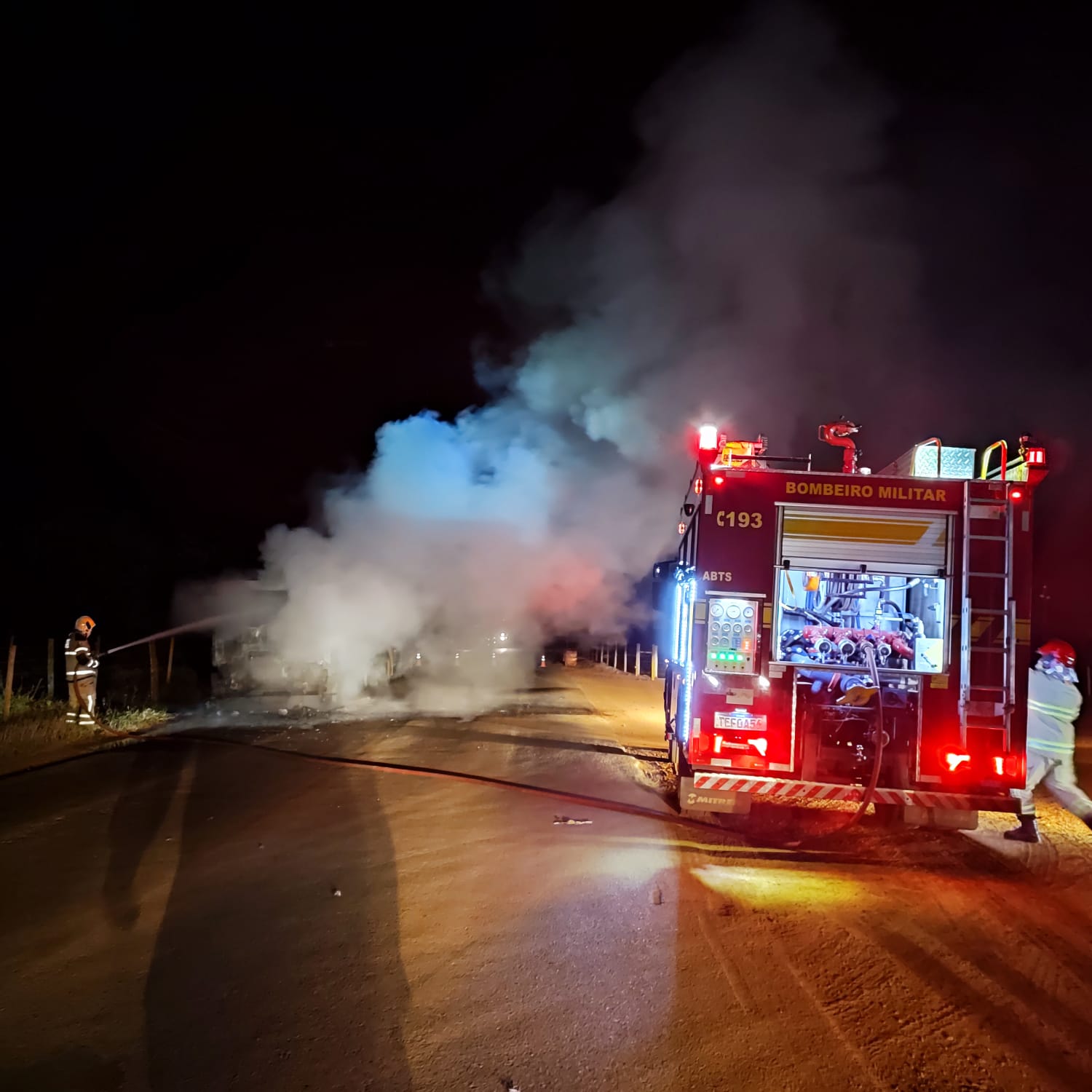 Quando os militares chegaram ao local, o fogo estava concentrado na parte frontal do veículo. As equipes conseguiram controlar as chamas em pouco tempo, evitando que o incêndio atingisse o tanque de leite e o reboque acoplado ao caminhão.