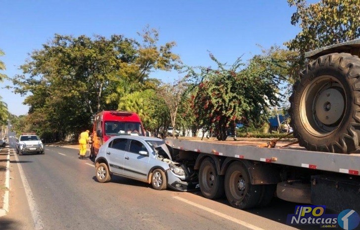 Um motorista de 48 anos sofreu fratura no nariz e um corte na sobrancelha após bater o carro na traseira de um caminhão prancha. O acidente aconteceu na tarde deste sábado (10/07) na Avenida Juscelino Kubitschek (JK) em Patos de Minas.