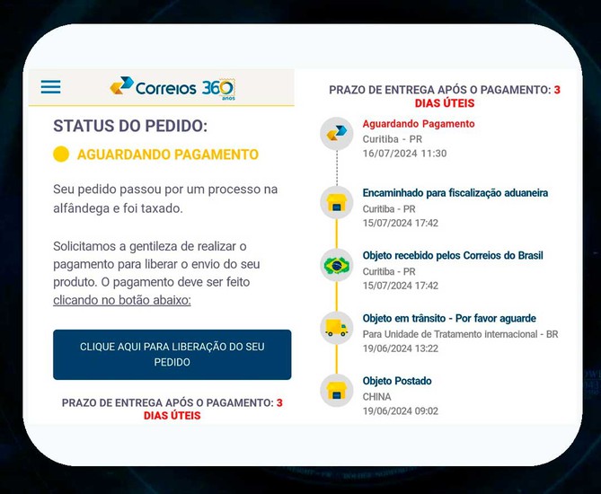 Os golpistas não param de criar formas de enganar as pessoas e algumas fraudes são arquitetadas meticulosamente. O golpe do pagamento de tributo para receber encomenda dos Correios chama a atenção pela sofisticação. Para aplicar o estelionato, os infratores criaram uma página na internet que simula o rastreamento da encomenda, indica que o produto foi para a zona aduaneira e informa a chave pix para agilizar a liberação do produto.