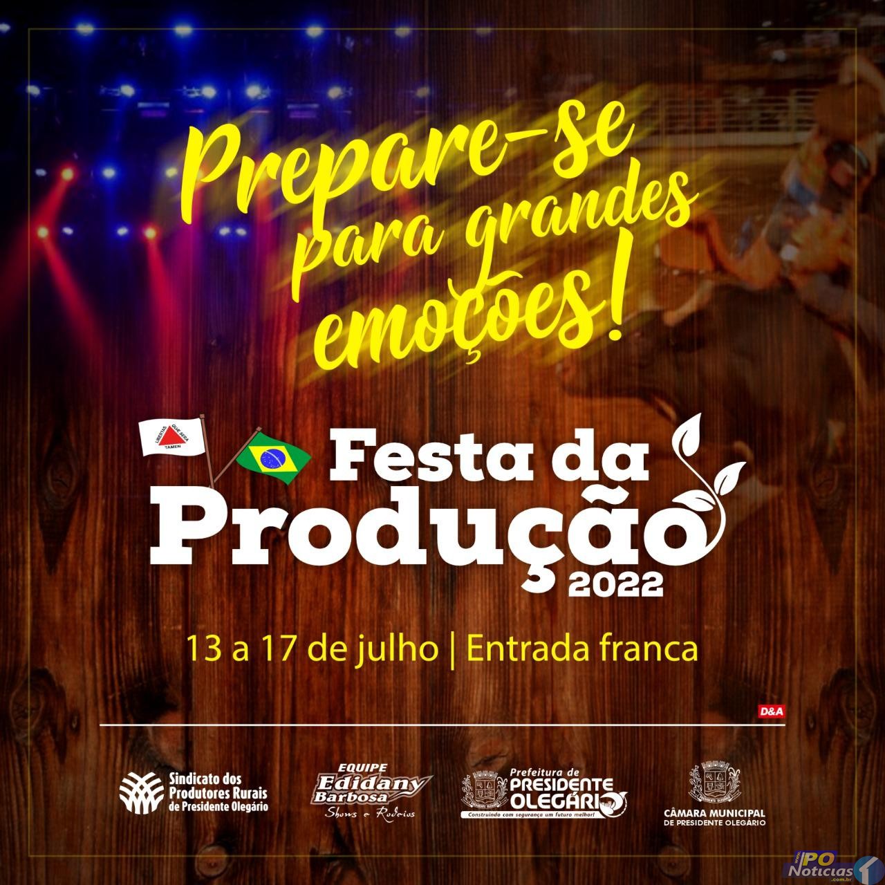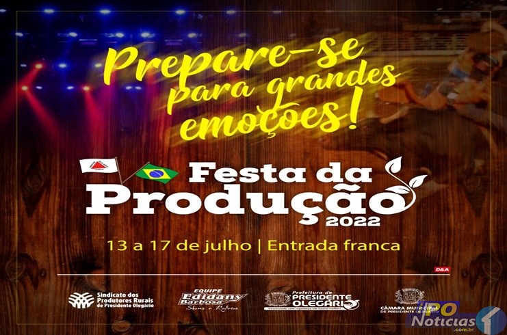 O Sindicato dos Produtos Rurais de Presidente Olegário divulgou na manhã deste sábado (12/03), que a Festa da Produção acontece de 13 a 17 de julho, no Parque de Exposições Antônio Secundino de São José. O evento festivo mais tradicional da cidade volta depois de 2 anos, sendo que em 2020 e 2021, a festa foi adiada devido a pandemia do novo coronavírus (Covid-19).