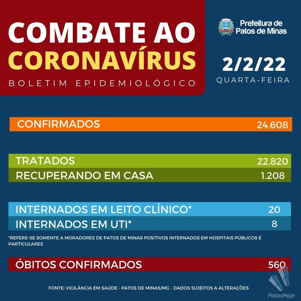 Segundo o boletim, dos 421 casos confirmados, dois são desta quarta-feira (02), 87 casos são de ontem, dia 1º, 81 casos do dia 31, 37 casos do dia 30 de janeiro e outros 214 casos de dias anteriores. Com mais este aumento, Patos de Minas alcançou a marca de 22.820 casos positivos de Covid-19 desde o início da pandemia.