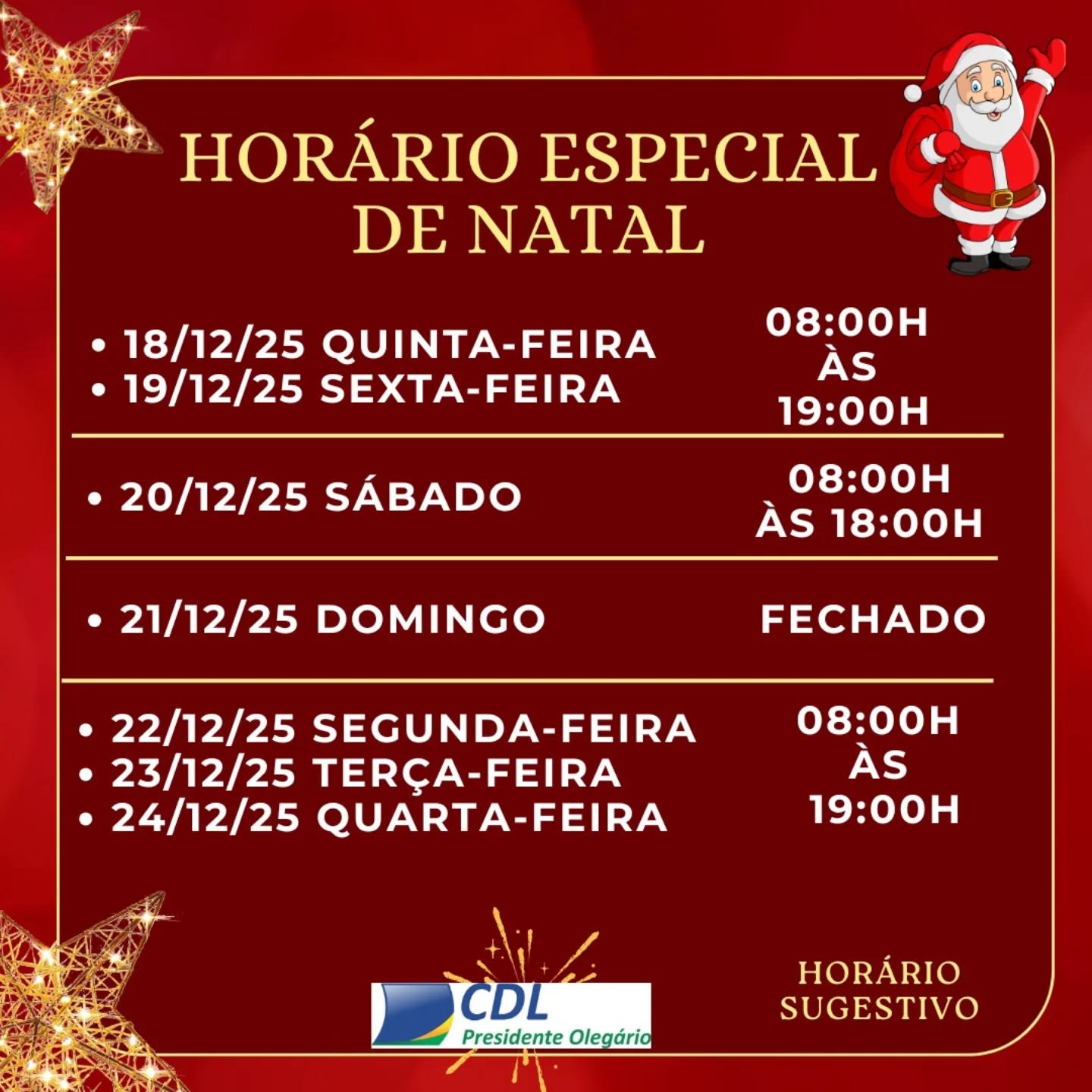 Inicia nesta quinta-feira (18), o horário especial de Natal no comércio de Presidente Olegário, com atendimento estendido até as 19h, medida que segue até a quarta-feira (24). A ampliação do horário tem como objetivo facilitar as compras de fim de ano e impulsionar as vendas na cidade.