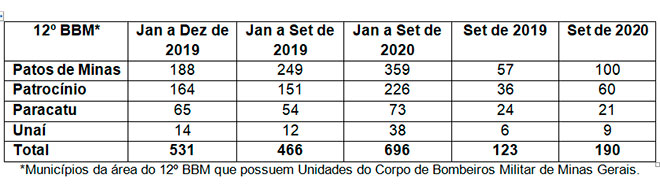 De acordo com a Tenente Karla, na área do 12º Batalhão de Bombeiros Militares com sede em Patos de Minas e que abrange todo o Alto Paranaíba, até o mês de setembro, foram registradas 696 ocorrências de incêndios florestais, ou seja, um aumento de cerca de 49% em relação a este mesmo período no ano passado. Só em Patos de Minas, no período de Janeiro a Setembro foram registradas 359 ocorrências. Um aumento de 44% em relação a 2019.