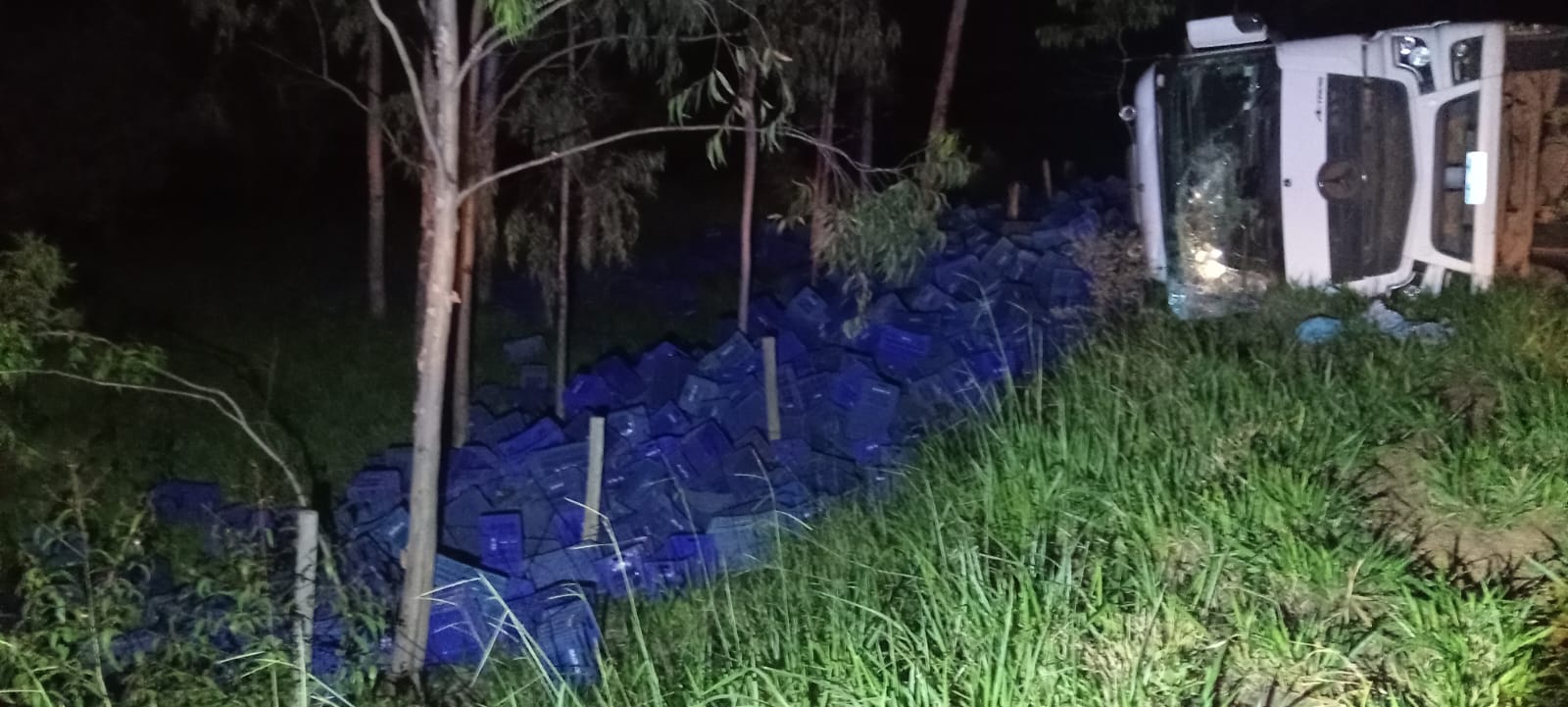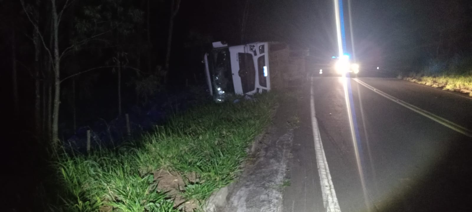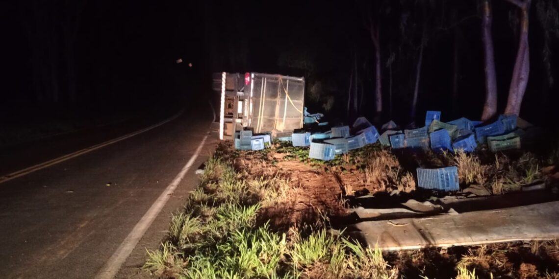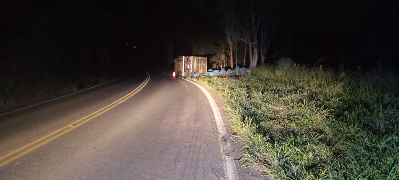 Três pessoas ficaram feridas após o tombamento de uma carreta carregada de abacates na MGC-354, no município de Lagamar, na noite desta quinta-feira (05).
