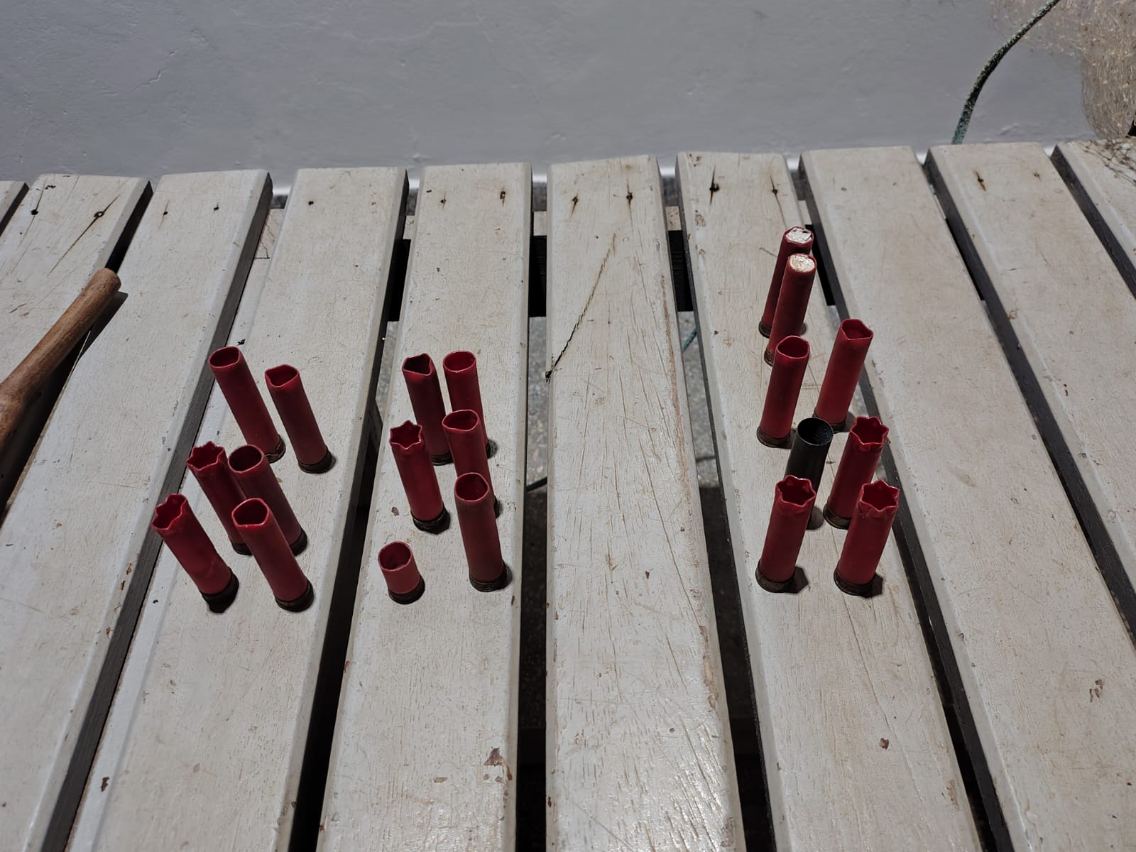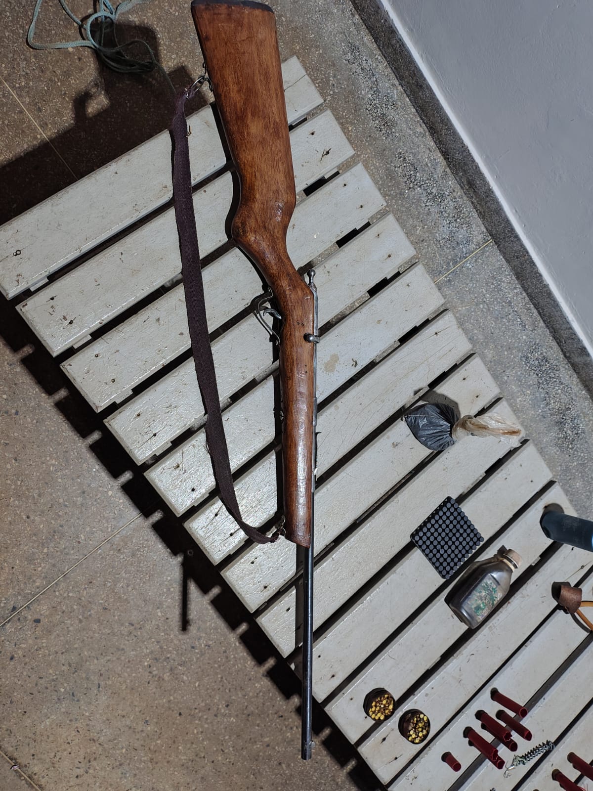 Foram encontrados no imóvel os seguintes materiais, 1 rifle cal. 22, 18 cartuchos cal. 32 deflagrados, 2 cartuchos cal. 32 intactos, 2 frascos contendo espoletas, material de recarga de cartucho, 6 chuveirinhos, 2 tarrafas de medida proibida para a categoria, 1 carcaça de jacaré e 1 estilingue.