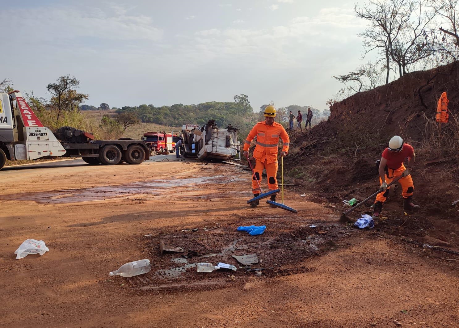 Enquanto o trânsito estava fechado para os guinchos removerem o veículo, o Corpo de Bombeiros realizou um importante trabalho no local que foi a remoção dos detritos provenientes do acidente assim como a remoção da grande quantidade de terra que foi arrancada do barranco e lançada na via. Também foi necessário fazer um serviço de retirada do óleo derramado na via, garantindo a segurança para os demais usuários que trafegam pelo local.
