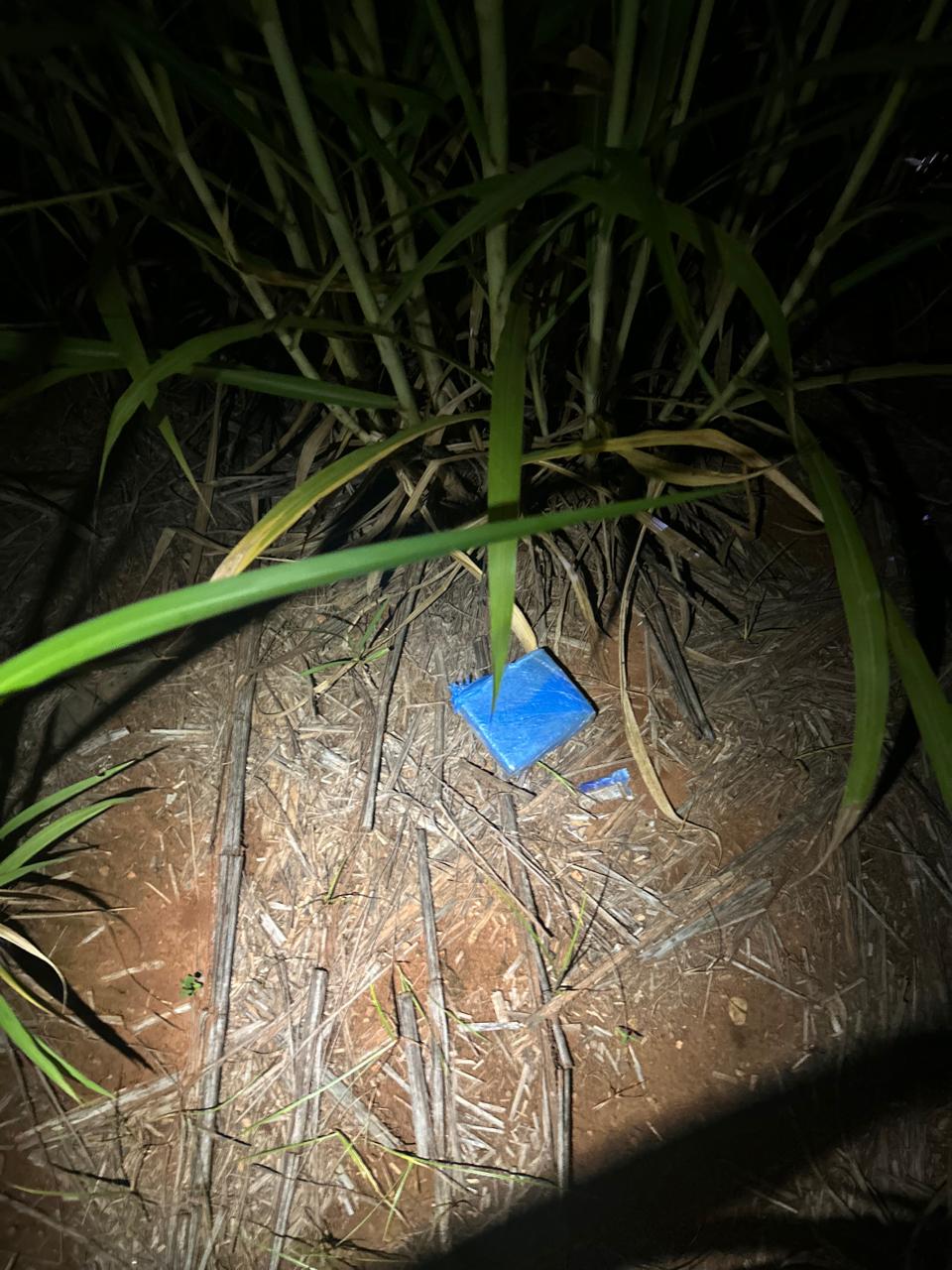 Após uma varredura na área, em meio à vegetação densa e alta, a equipe policial encontrou uma barra de substância semelhante à pasta base de cocaína.