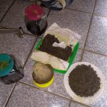 Foram encontrados no local refratários, potes, pratos e coador que possivelmente estavam sendo usados para transformação de maconha em haxixe, uma droga que é também mais cara.