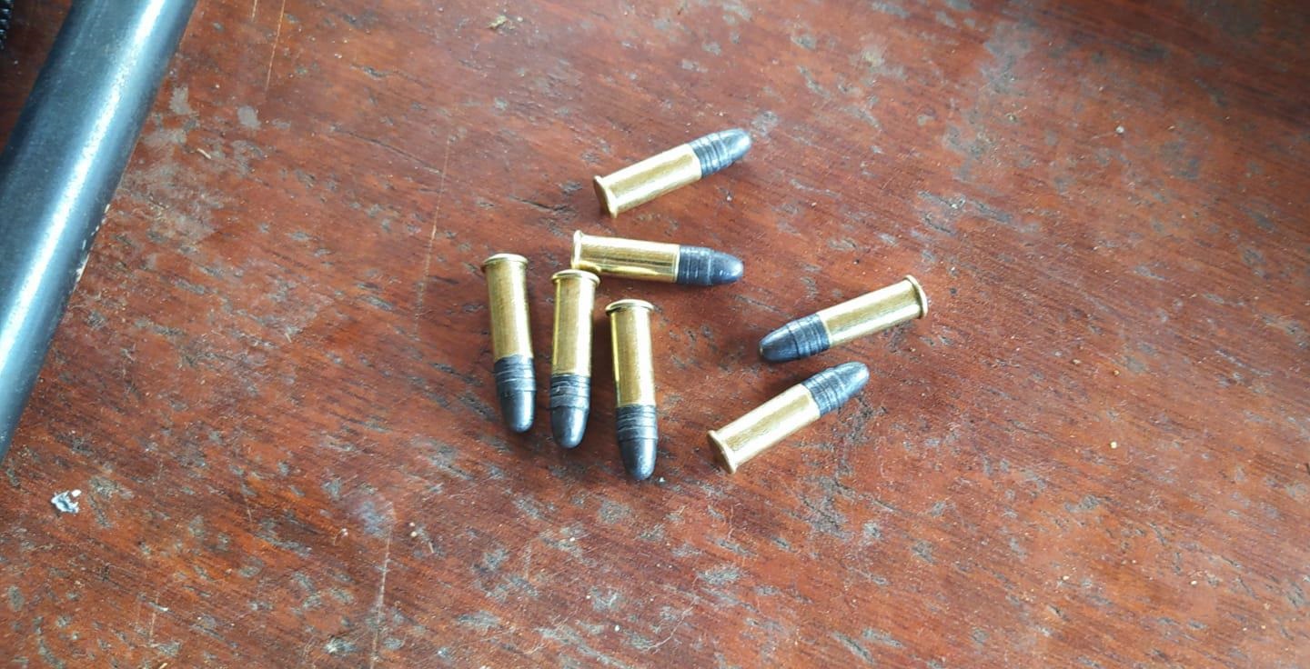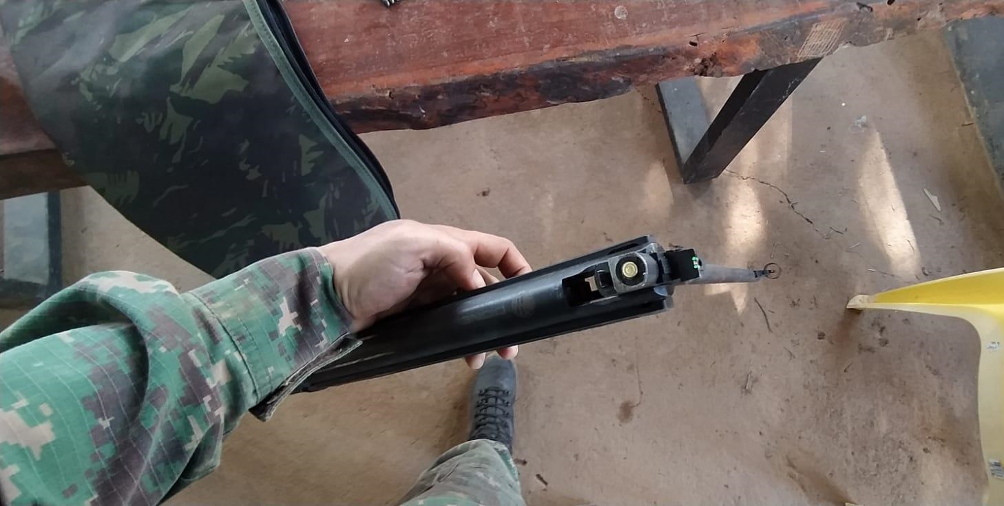 Os militares avistaram uma espingarda (carabina/rifle) da marca Rossi, adaptada para o calibre .22, guardada atrás de uma estante na residência. A arma estava com uma munição intacta na câmara e outras seis munições do mesmo calibre foram encontradas em um compartimento da coronha. Ele não possuía documentação que autorizasse a posse do armamento. Segundo ele, a arma era de pressão, mas os policiais verificaram que ela havia sido adaptada para calibre .22.