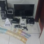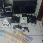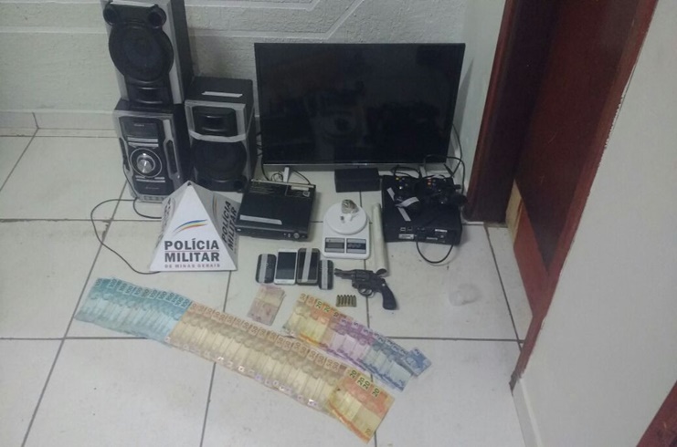 A Polícia Militar apreendeu na noite desta quarta-feira (14/02), uma arma de fogo calibre 38, quatro munições intactas calibre 38 e duas percutidas, porções de substâncias semelhantes a crack e maconha, uma TV, um vídeo, um DVD, um som, todos de procedência duvidosa e, uma grande quantia em dinheiro. Três pessoas, sendo dois menores foram encaminhados para a Delegacia de Polícia Civil de Presidente Olegário.