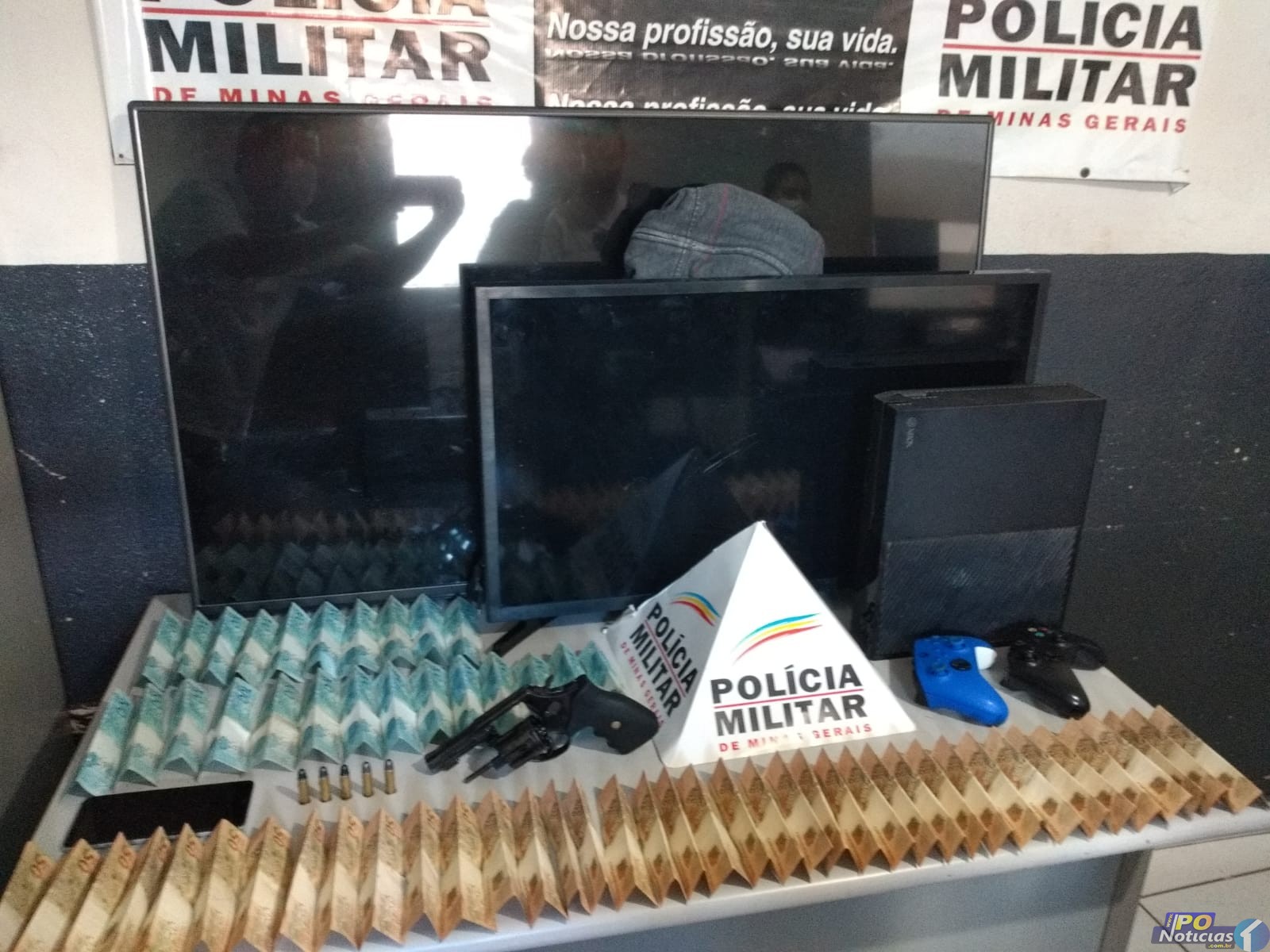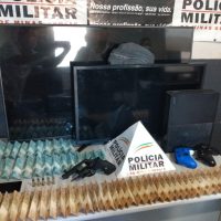 Um adolescente de 16 anos foi apreendido e um rapaz de 29 anos foi preso. Os militares recuperaram dois aparelhos de TV (50″ e 32″), um videogame e R$ 4.350,00 dinheiro, sendo parte deste valor pertencente a vítima. Um revólver calibre 38 carregado com cinco munições foi apreendido. Os suspeitos e o material foram levados para a delegacia de Polícia Civil de Patos de Minas.