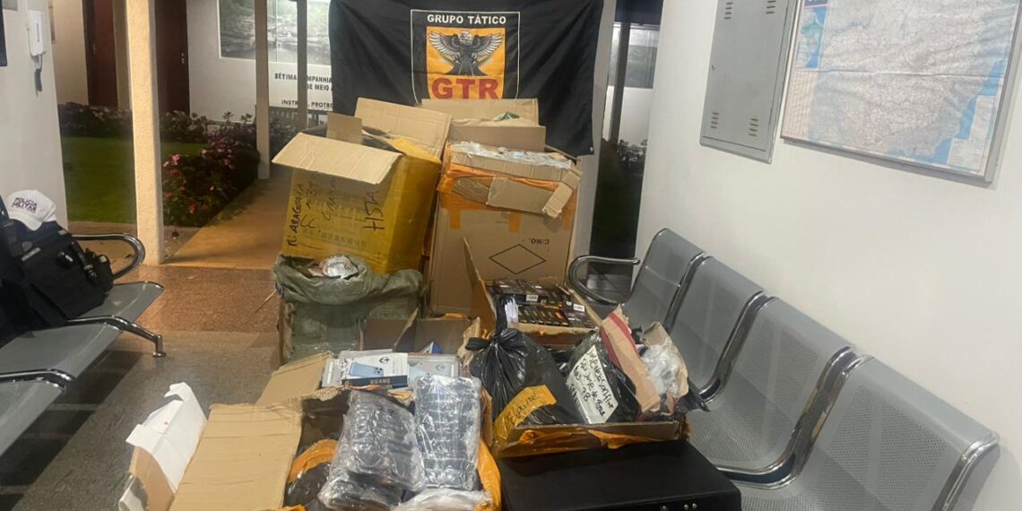 A Polícia Militar Rodoviária apreendeu grande quantidade de mercadorias de origem estrangeira transportadas de forma irregular em um ônibus, BR146, em Patos de Minas. A ação ocorreu no início da noite deste domingo (11), no ônibus fretado, e fez parte da operação “Última Parada”. Acessórios, óculos de sol e brinquedos sem certificação do INMETRO, além de cigarros eletrônicos, foram apreendidos.