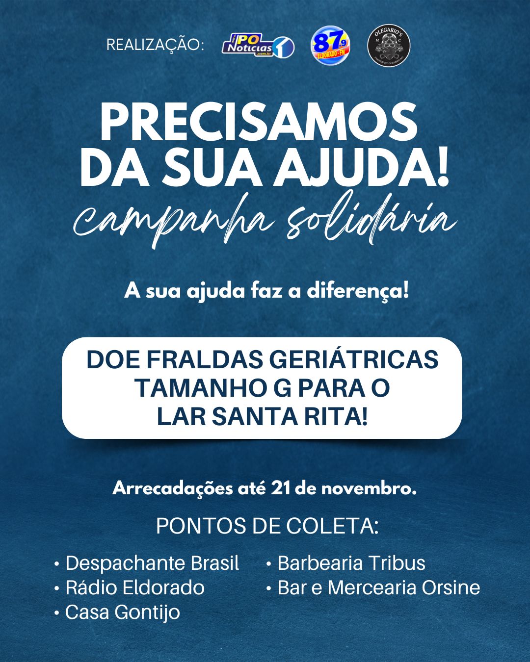 O Portal PO Noticias, Rádio Eldorado FM e Olegario’s Motoclube uniram-se em uma ação solidária para coletar fraldas geriátricas tamanho “G” para o Lar Santa Rita de Presidente Olegário.