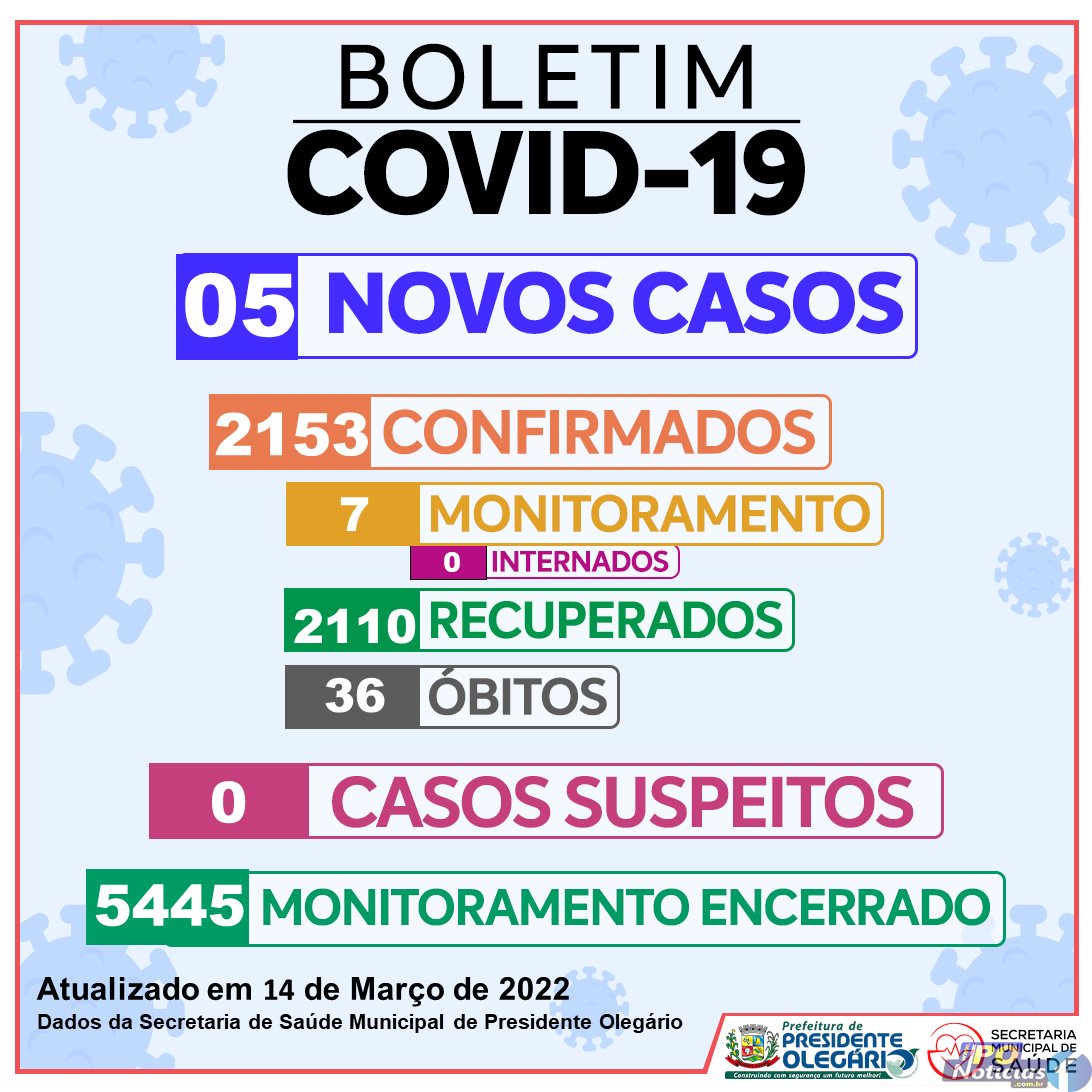 O boletim divulgado nesta segunda-feira (14/03) pela Secretaria Municipal de Saúde mostra que foram registrados em Presidente Olegário mais 05 casos de Covid-19 durante o fim de semana.