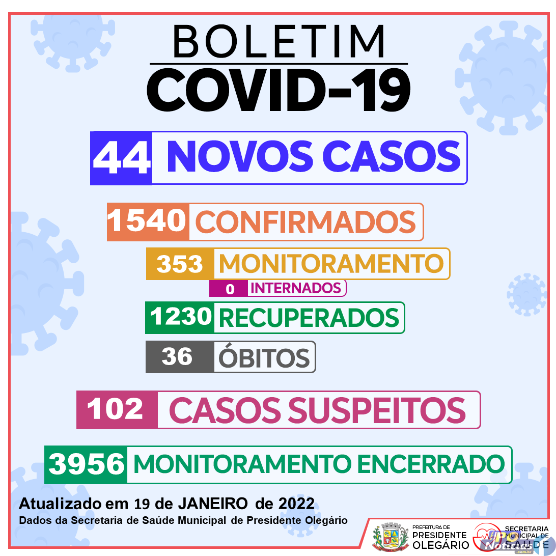 Presidente Olegário registrou na tarde desta quarta-feira (19/01) mais 44 casos confirmados do novo coronavírus (Covid-19), o que fez o total aumentar para 1540 casos. Segundo a Secretaria Municipal de Saúde (SMS), o município contabiliza 36 mortes desde o início da pandemia.
