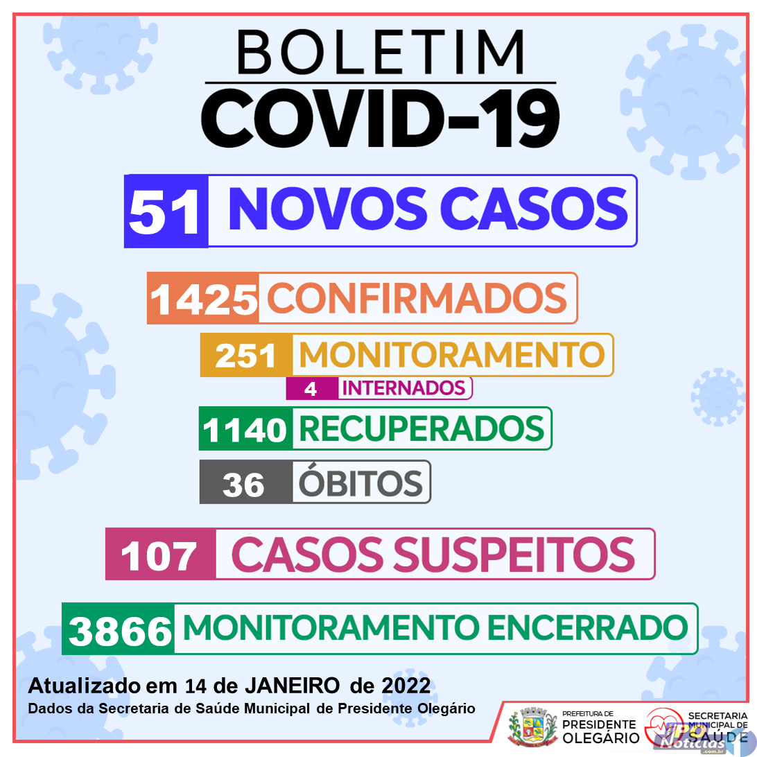 Presidente Olegário registrou na tarde desta sexta-feira (14/01) mais 51 casos confirmados do novo coronavírus (Covid-19), o que fez o total aumentar para 1425 casos. Segundo a Secretaria Municipal de Saúde (SMS), o município contabiliza 36 mortes desde o início da pandemia.
