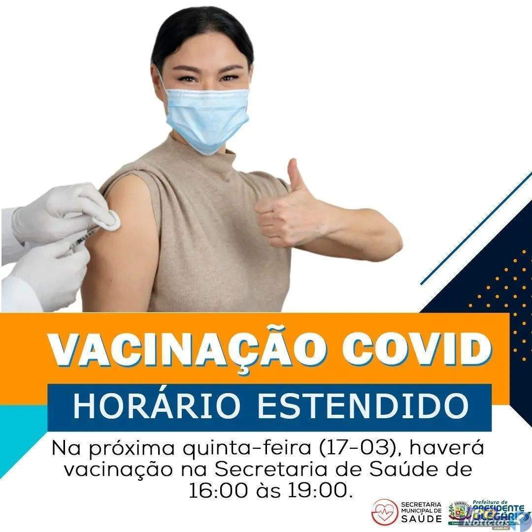 A Prefeitura de Presidente Olegário por meio da Secretaria Municipal de Saúde, informa que na próxima quinta-feira (17/03), terá horário especial para a vacinação contra a Covid-19, com intuito de atender o maior número de pessoas.