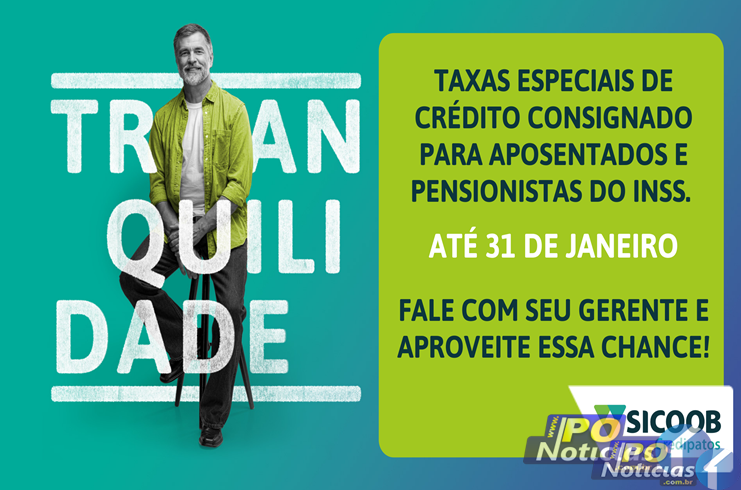 É aposentado ou pensionista do INSS e quer começar o ano com dinheiro no bolso? Seja para realizar sonhos ou colocar as contas em dia, o Sicoob Credipatos oferece a oportunidade que você precisa. De 17 a 31 de janeiro, taxas de Crédito Consignado* até 26% menores. A campanha é válida para cooperado e não cooperado.