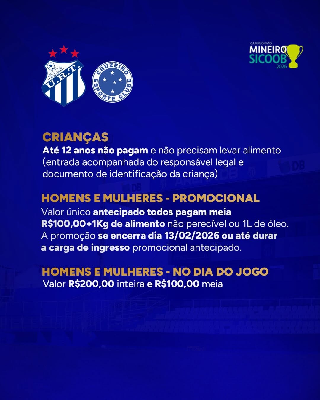 A URT anunciou, na noite desta terça-feira (30), a venda antecipada de ingressos para o jogo contra o Cruzeiro. A partida será disputada no dia 14 de fevereiro, às 16h30, na Arena DB. Os primeiros mil ingressos serão comercializados por R$ 100,00, mais 1 kg de alimento não perecível. As vendas começam na sexta-feira (02), às 9h.