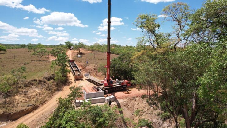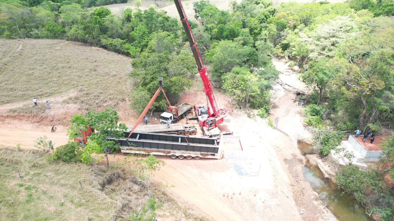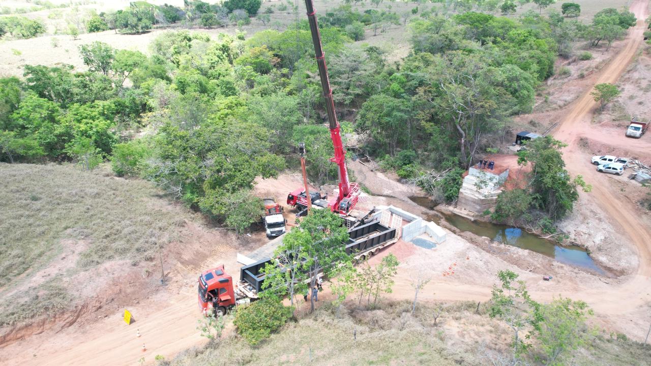 Um guindaste de grande porte foi utilizado para a operação de içamento de duas vigas, no canteiro de obras da ponte sobre o Córrego da Tapera, na zona rural de Presidente Olegário. A operação aconteceu na manhã desta quinta-feira (23). Funcionários das empresas terceirizadas foram os responsáveis pelo encaixe das peças.